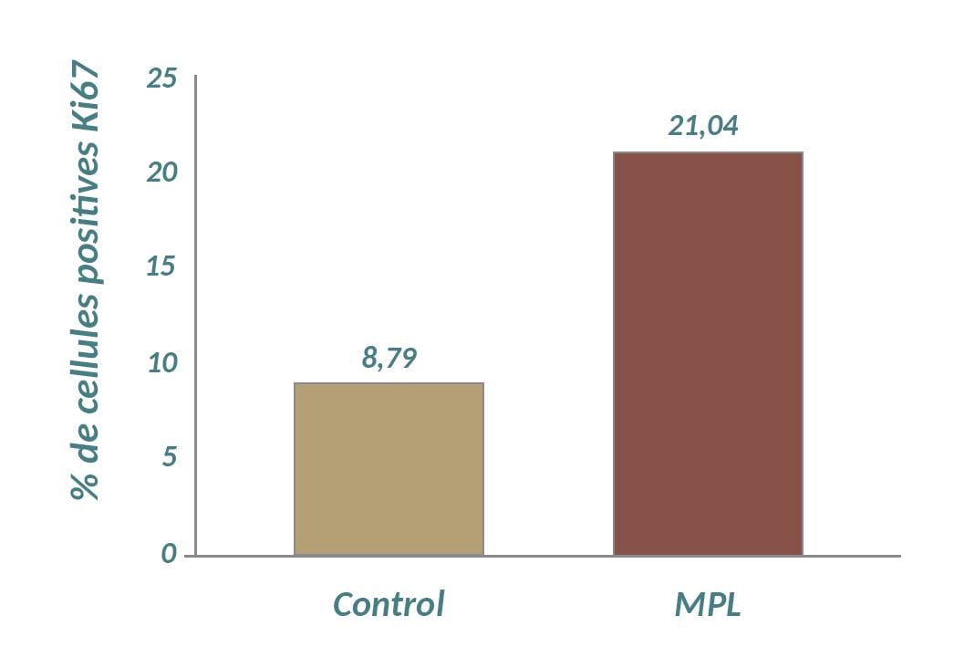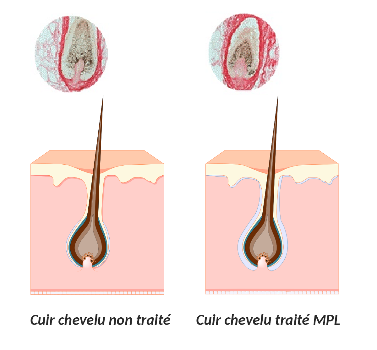 La papille dermique produit par ailleurs une matrice extracellulaire, constituée notamment de collagène et des glycosaminoglycanes. Le traitement a permis d’augmenter de 21% l’épaisseur de la gaine de collagène entourant le bulbe du cheveu, renforçant son ancrage.