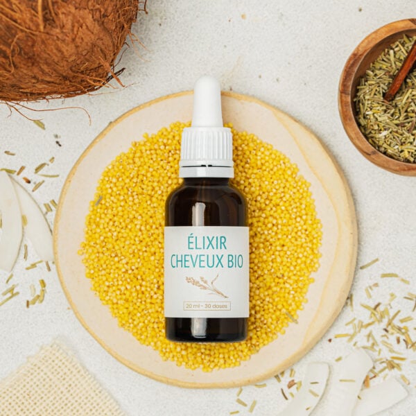 Elixir contient en plus de l’extrait de millet breveté une huile concentrée en triglycérides à chaînes moyennes de noix de coco issue de l’agriculture biologique.