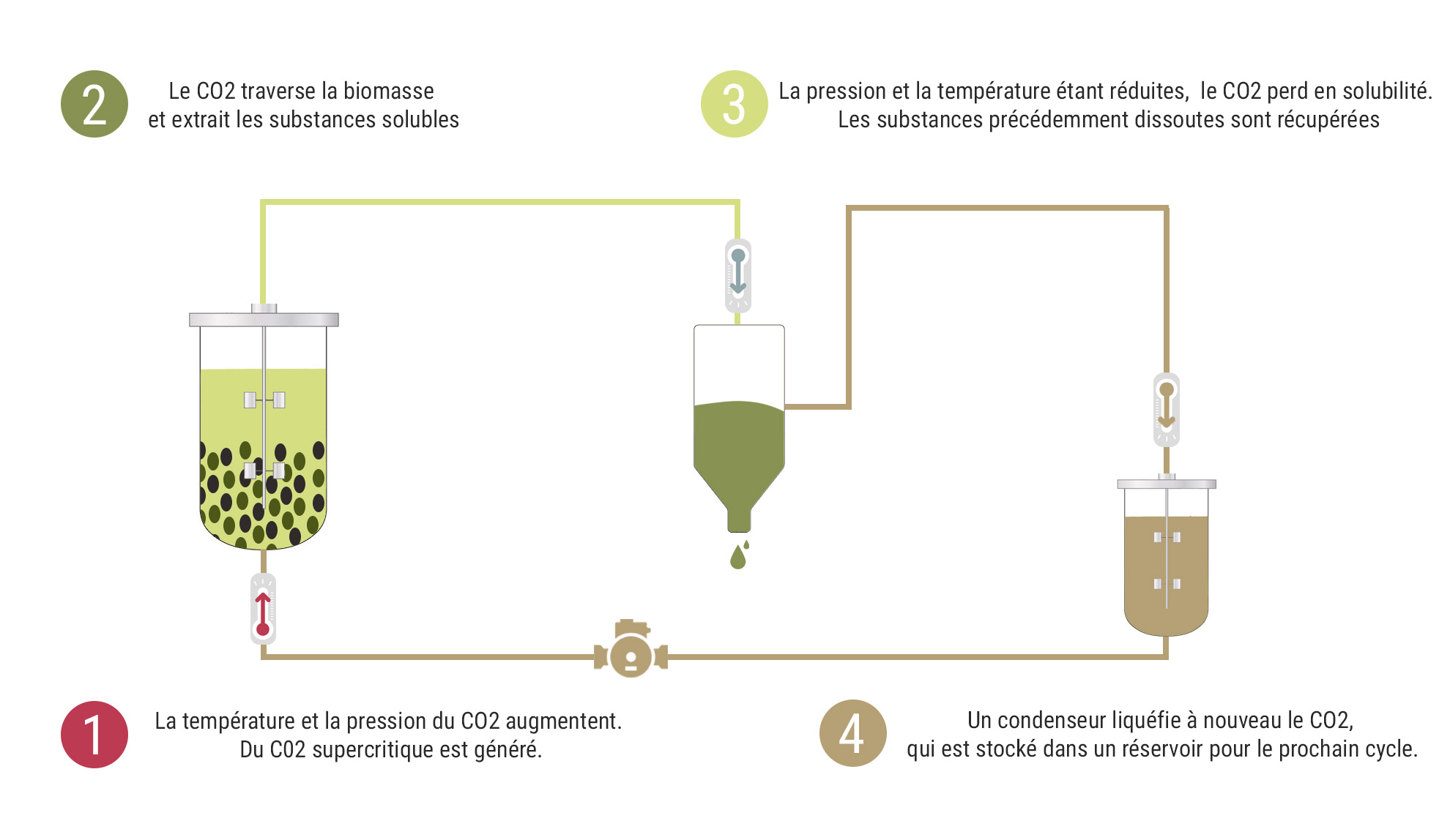 Les graines de millet séchées et broyées sont placées dans une chambre d’extraction. Le dioxyde de carbone, une fois amené à un état supercritique où il possède à la fois des propriétés de gaz et de liquide, traverse les graines.