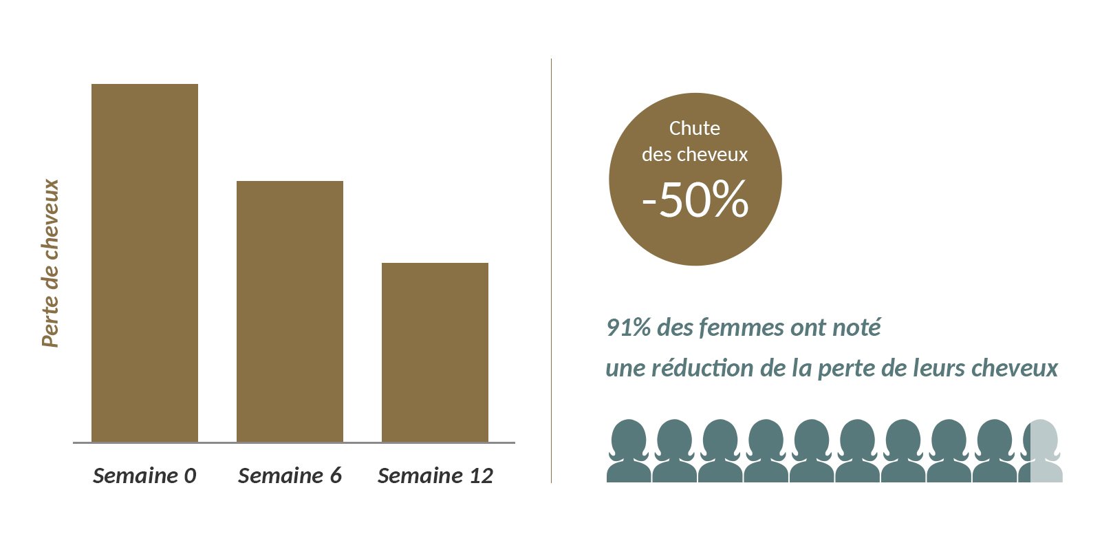 Le traitement actif est parvenu à réduire la densité de cheveux en phase télogène, qui est passée de 48 cheveux/cm² au début de l’étude à 24 cheveux/cm² après 12 semaines de traitement, soit une amélioration de 50%. Le phénomène à l’origine de la chute des cheveux s’est ainsi inversé, et 91% des participantes ont pu constater cette amélioration.